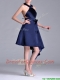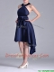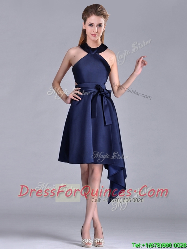 Elegant Halter Top Asymmetrical Navy Blue Prom Dress in Satin