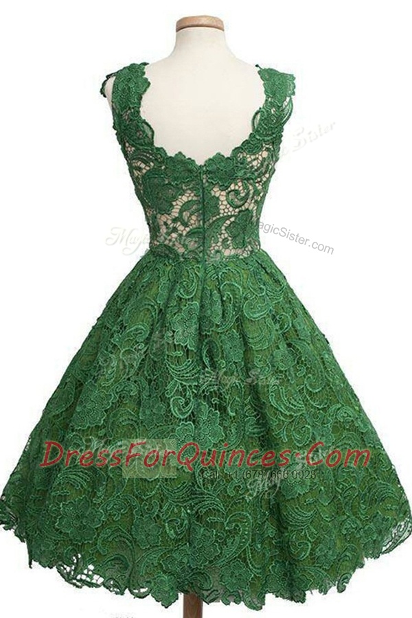 Glorious Scoop Sleeveless Prom Gown Knee Length Appliques Dark Green Lace