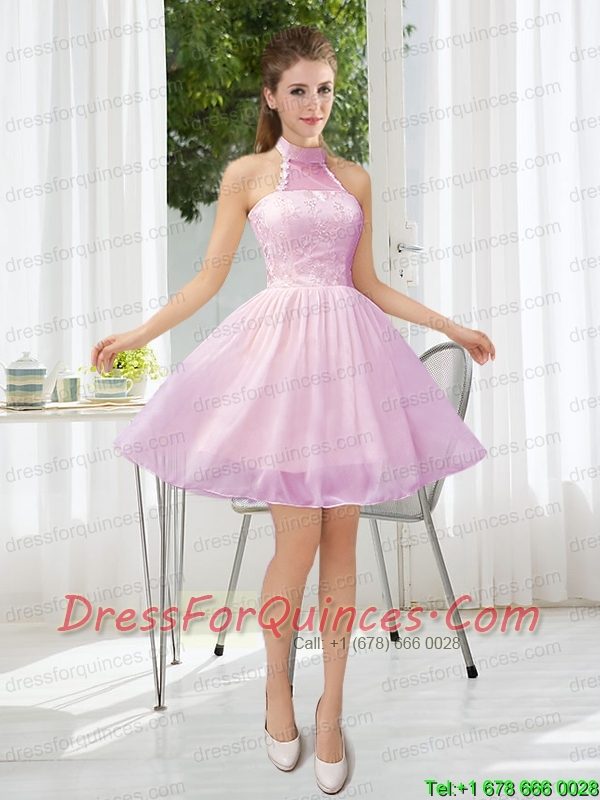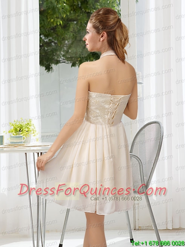Halter Appliques Lace Up Prom Dress in Champagne