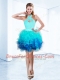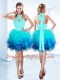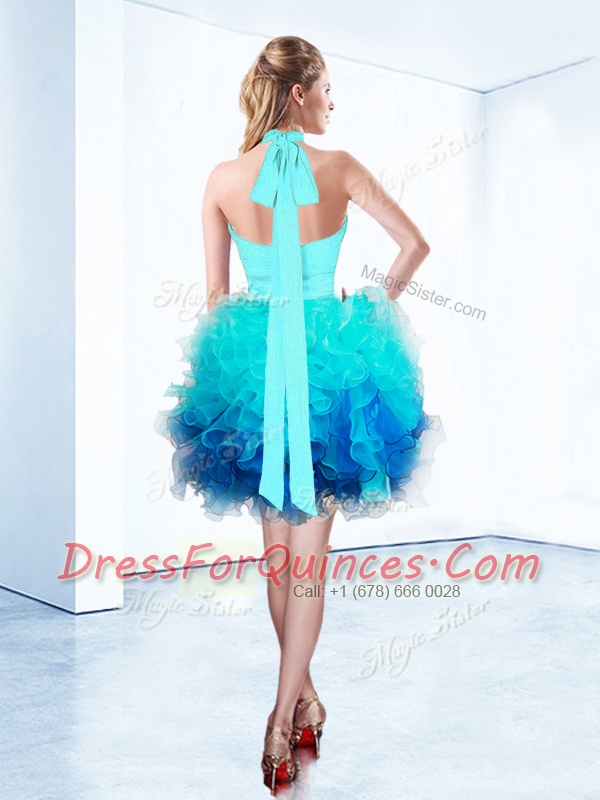 Halter Top Aqua Blue Sleeveless Knee Length Ruffles and Ruching and Belt Zipper
