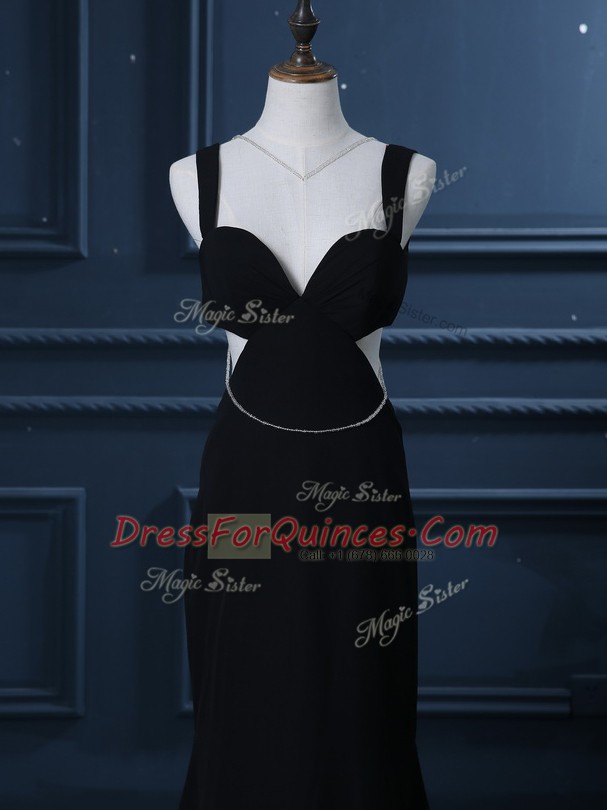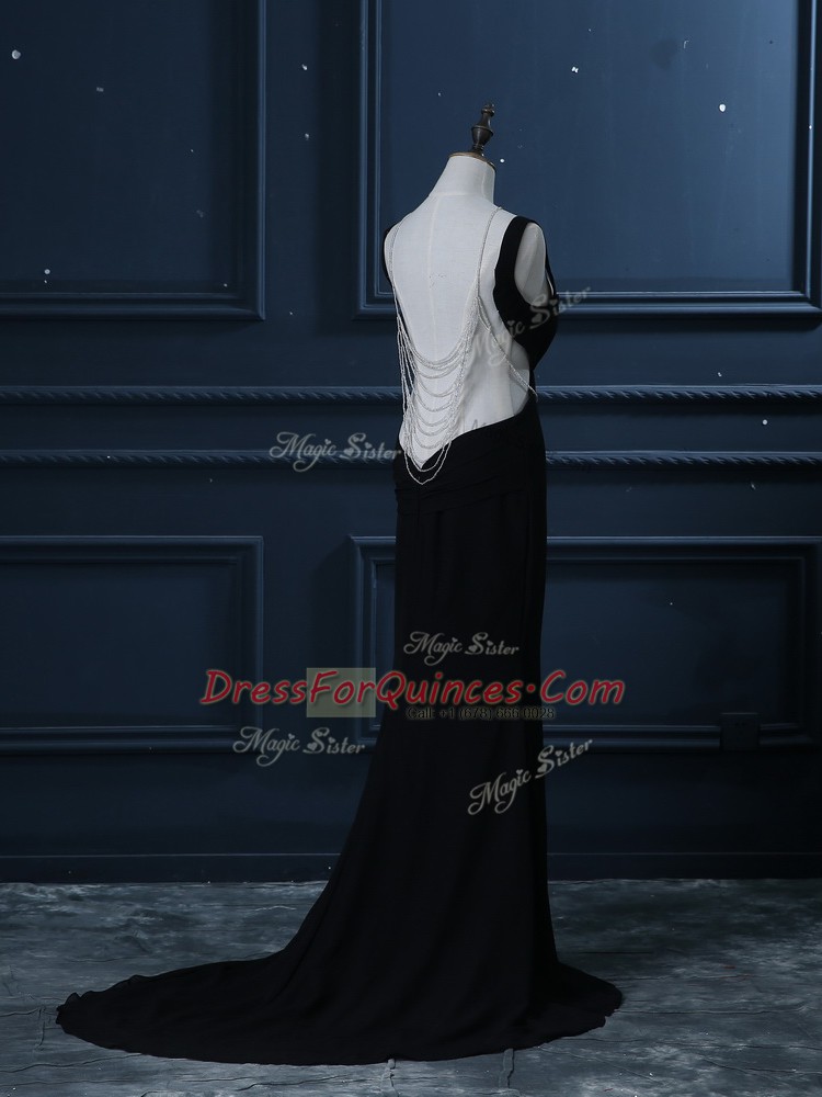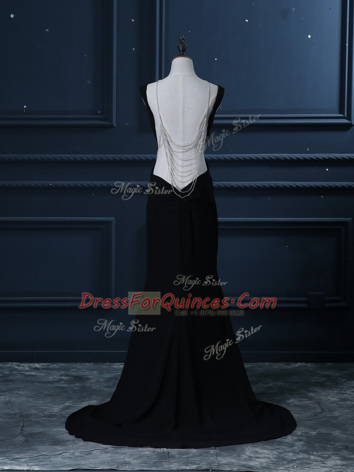 Perfect Black Chiffon Backless Prom Evening Gown Sleeveless Brush Train Beading