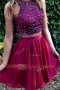 Popular Two Pieces Prom Dresses Fuchsia Halter Top Chiffon Sleeveless Knee Length Criss Cross