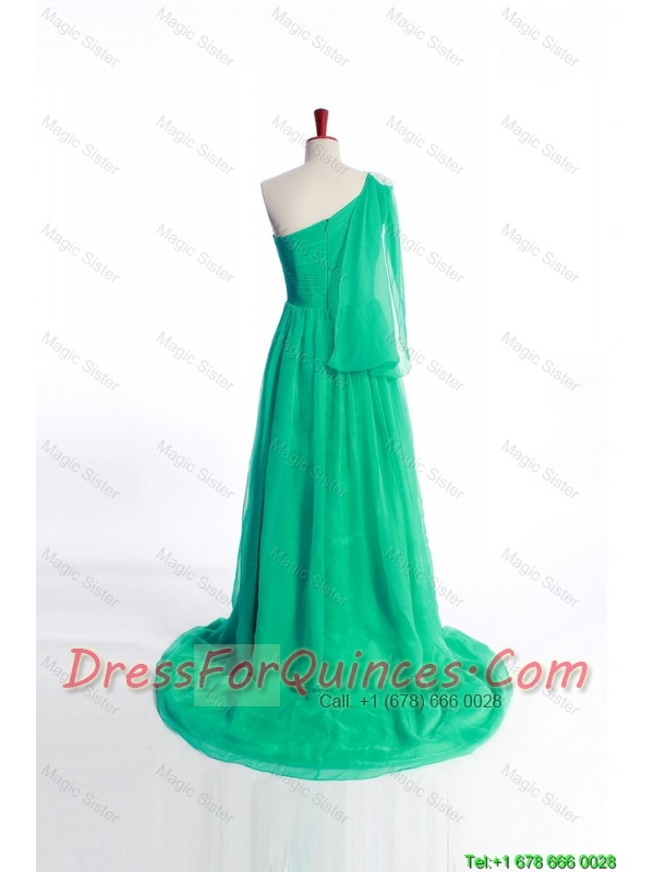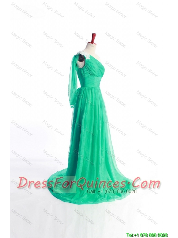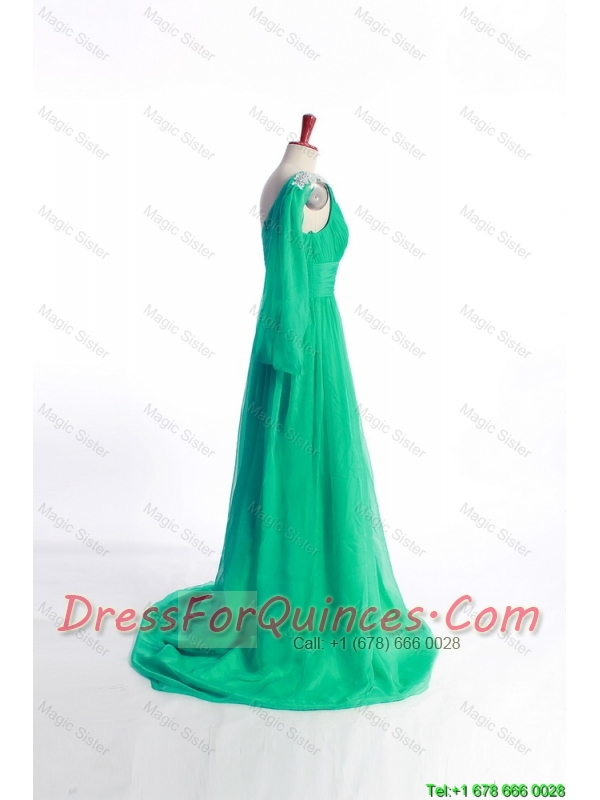 Pretty Affordable Appliques Green Long Prom Dress with Sweep Train for 2016