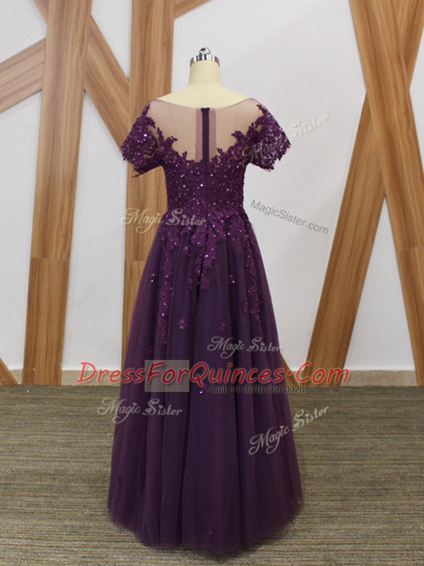 Purple Short Sleeves Tulle Zipper Prom Dress for Prom and Military Ball