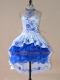 Royal Blue Satin and Organza Lace Up Halter Top Sleeveless High Low Homecoming Dress Embroidery and Ruffles