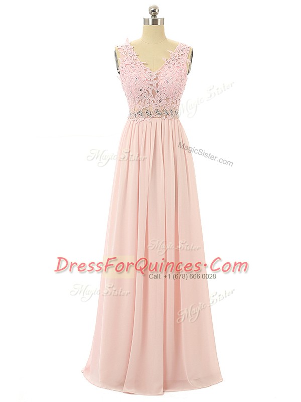 Sleeveless Chiffon Floor Length Zipper Prom Dresses in Pink with Beading and Appliques