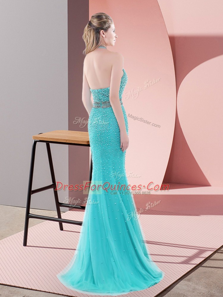 Spectacular Yellow Green Tulle Backless Prom Party Dress Sleeveless Sweep Train Beading