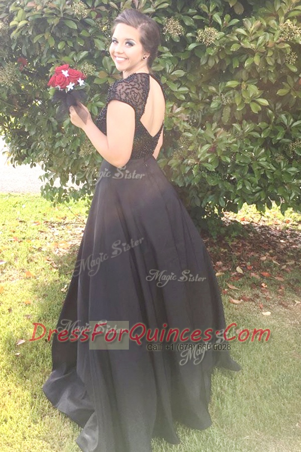 Suitable Scoop Beading Dress for Prom Black Backless Cap Sleeves Floor Length