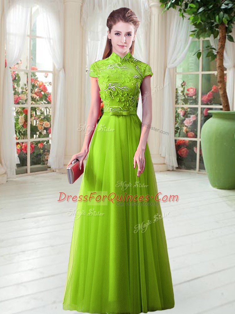 Tulle Lace Up Dress for Prom Cap Sleeves Floor Length Appliques