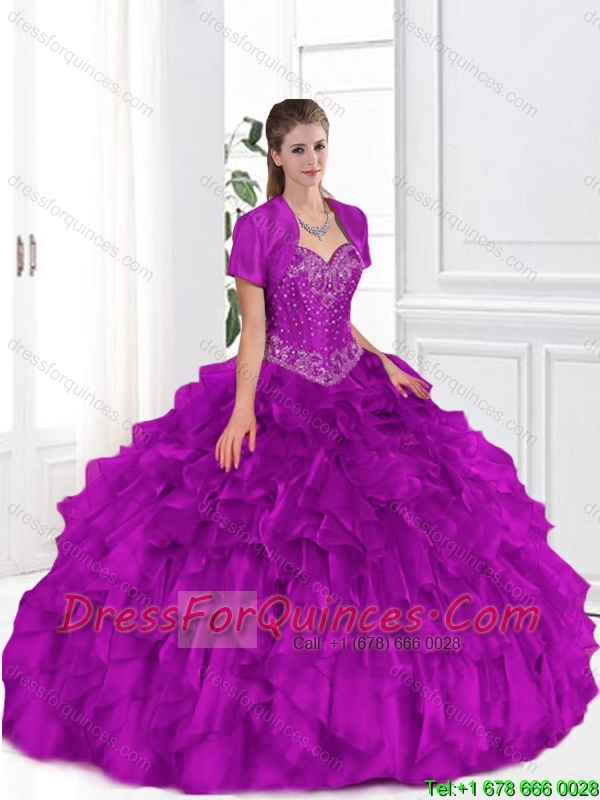 2015 Cheap Beaded and Ruffles Sweet 16 Gowns in Fuchsia