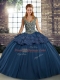 Admirable Straps Sleeveless Quinceanera Dress Floor Length Beading and Appliques Navy Blue Tulle
