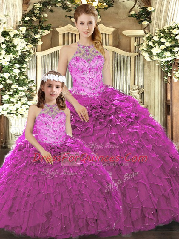 Beading and Ruffles Vestidos de Quinceanera Fuchsia Lace Up Sleeveless Floor Length