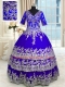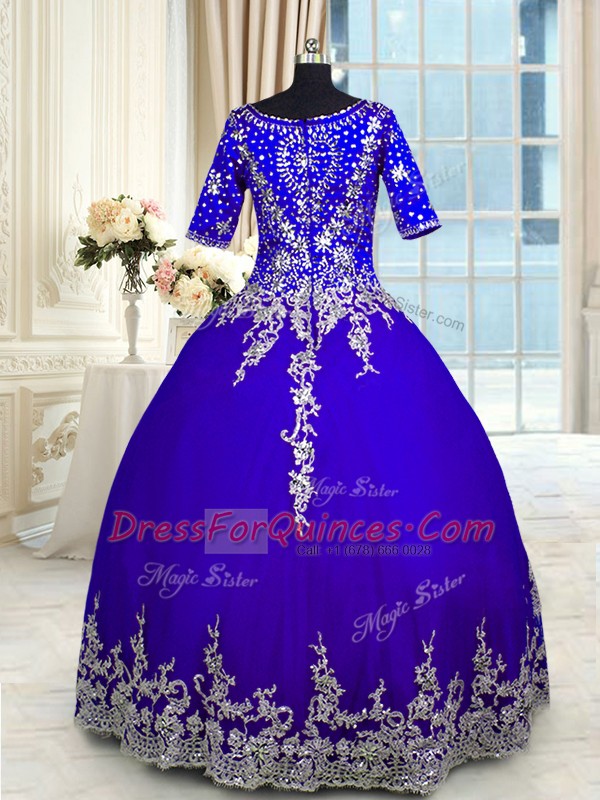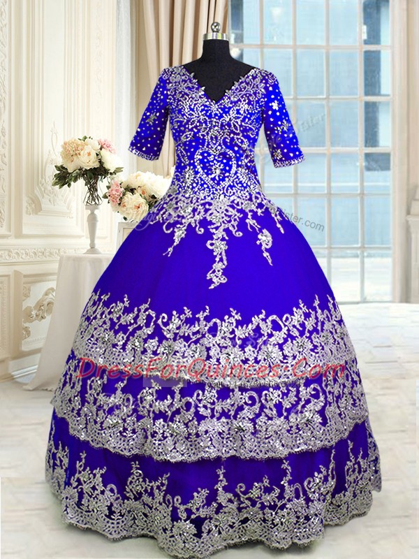 Blue Satin and Tulle Zipper Vestidos de Quinceanera Half Sleeves Floor Length Appliques and Ruffled Layers