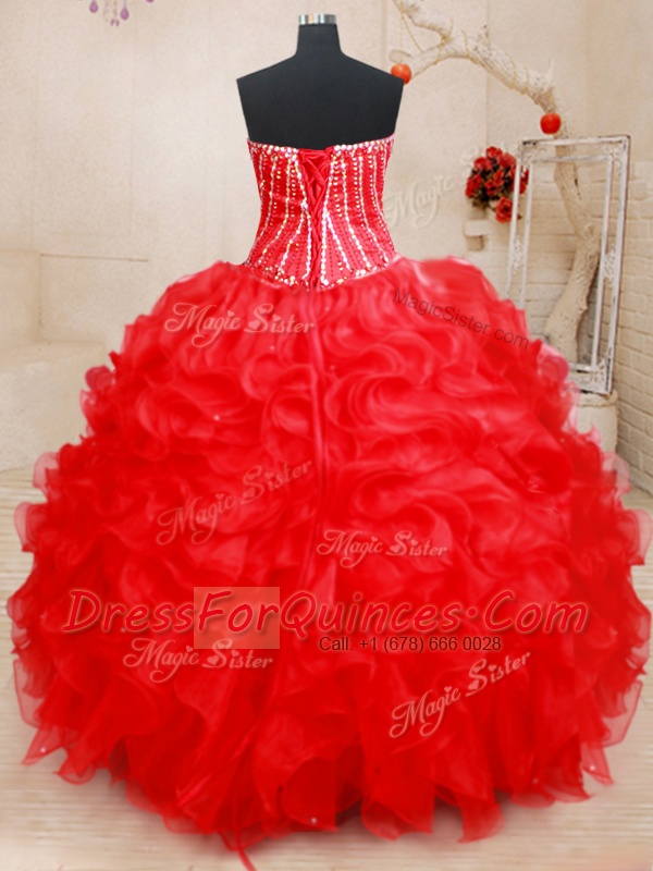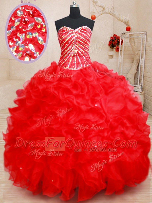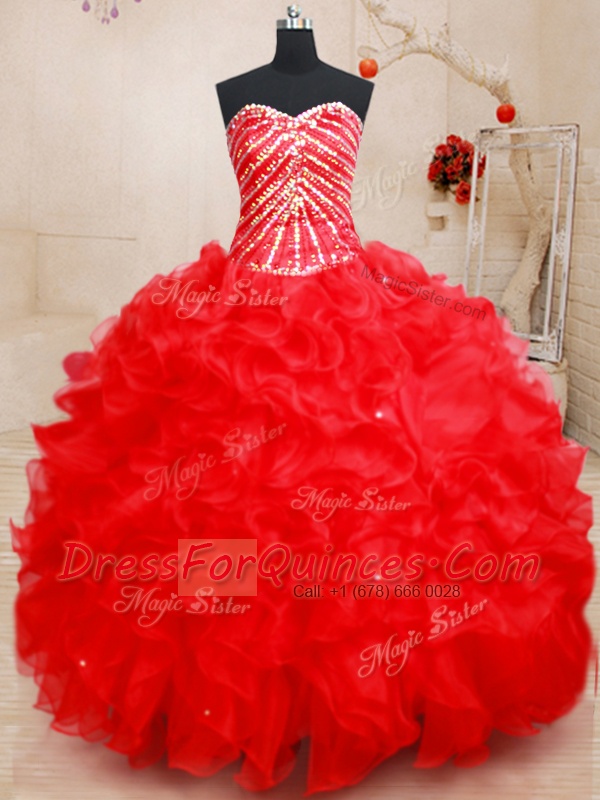 Exceptional Sweetheart Sleeveless Quince Ball Gowns Floor Length Beading and Ruffles Red Organza
