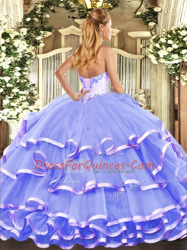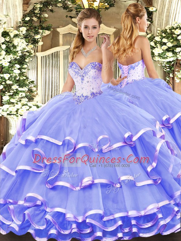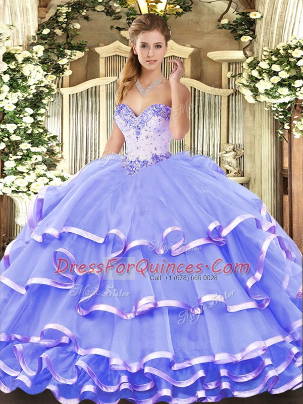 Floor Length Lavender Sweet 16 Quinceanera Dress Organza Sleeveless Beading and Ruffled Layers