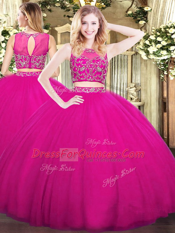Fuchsia Tulle Zipper 15 Quinceanera Dress Sleeveless Floor Length Beading