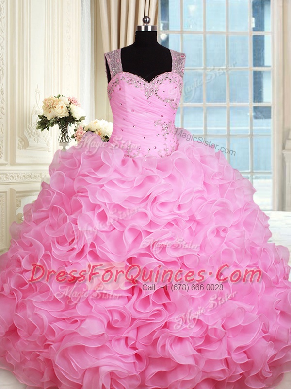 Graceful Straps Floor Length Zipper Quinceanera Dresses Rose Pink for Military Ball and Sweet 16 and Quinceanera with Beading and Ruffles
