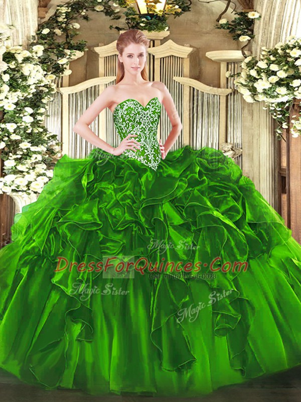 Green Vestidos de Quinceanera Military Ball and Sweet 16 and Quinceanera with Beading and Ruffles Sweetheart Sleeveless Lace Up