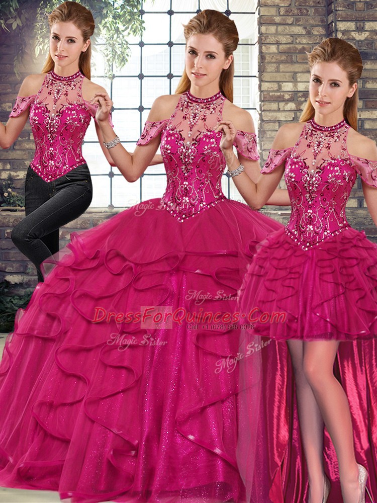 Halter Top Sleeveless Tulle Quinceanera Dresses Beading and Ruffles Lace Up