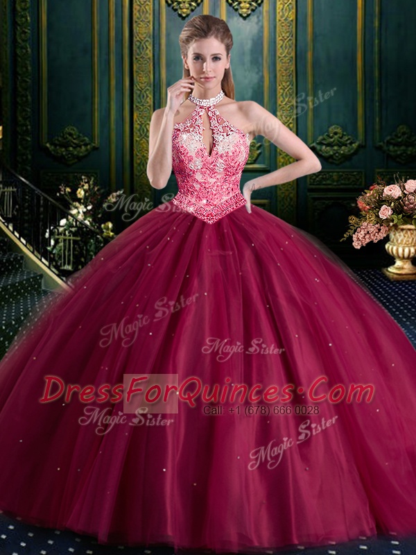 Halter Top Tulle High-neck Sleeveless Lace Up Beading and Lace and Appliques Sweet 16 Dresses in Burgundy