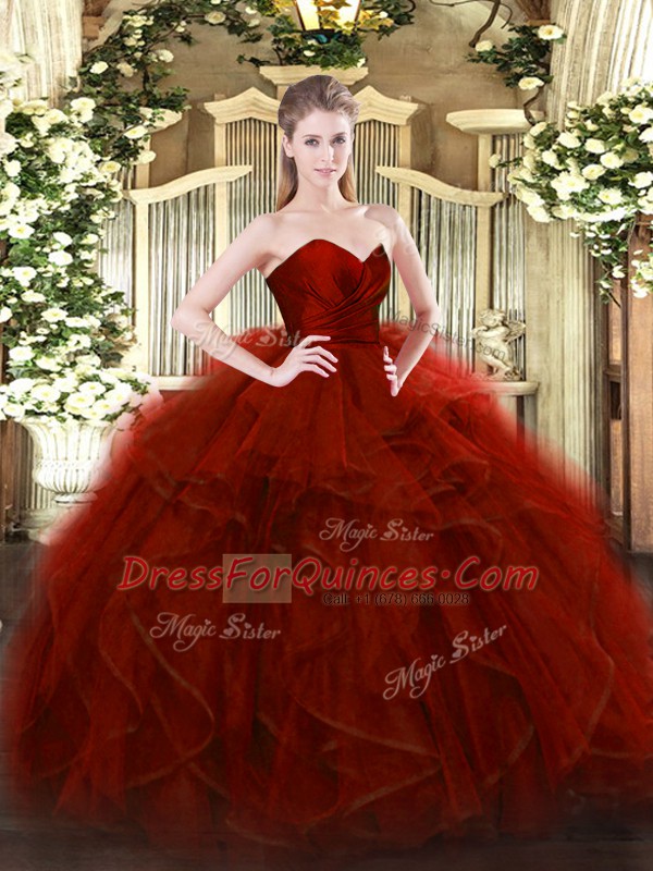 Modern Floor Length Zipper Quinceanera Gowns Wine Red for Military Ball and Sweet 16 and Quinceanera with Ruffles
