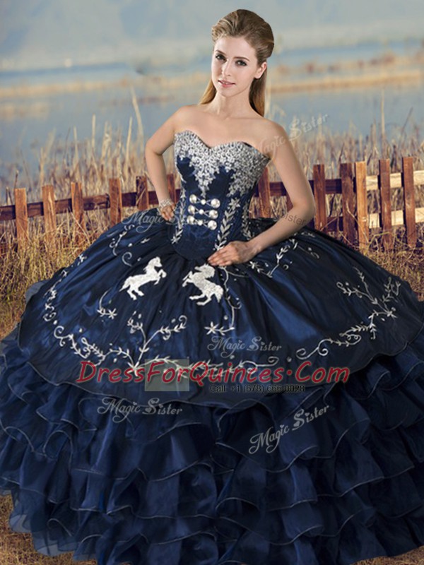 Navy Blue Satin and Organza Lace Up Sweetheart Sleeveless Floor Length Quinceanera Gowns Embroidery and Ruffles