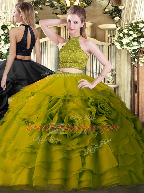 New Style Olive Green Halter Top Backless Beading and Ruffles Sweet 16 Dress Sleeveless