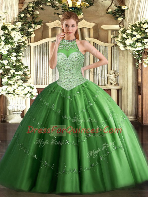 New Style Tulle Halter Top Sleeveless Lace Up Beading and Appliques Sweet 16 Quinceanera Dress in Green