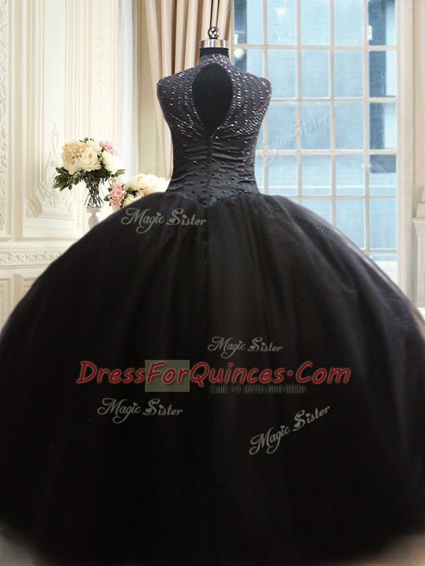 On Sale Black High-neck Neckline Beading Quinceanera Dresses Cap Sleeves Zipper