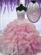 Organza Sweetheart Sleeveless Lace Up Beading and Ruffles 15th Birthday Dress in Rose Pink