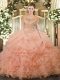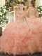Peach Tulle Clasp Handle Quince Ball Gowns Sleeveless Floor Length Beading and Ruffled Layers