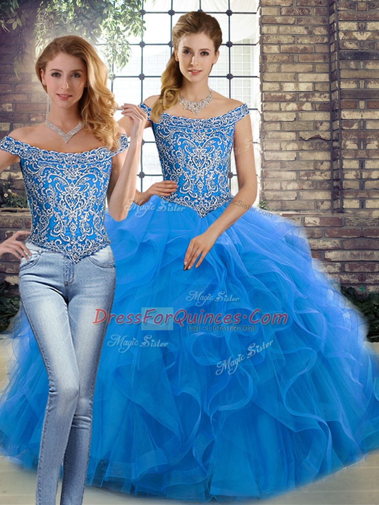 Romantic Blue Two Pieces Tulle Off The Shoulder Sleeveless Beading and Ruffles Lace Up Sweet 16 Dresses Brush Train