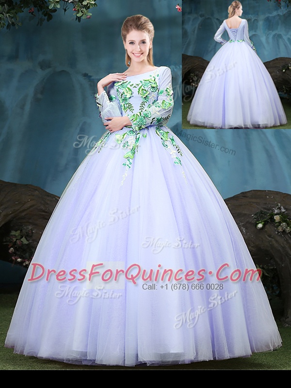 Scoop Floor Length Ball Gowns Long Sleeves Lavender Quince Ball Gowns Lace Up
