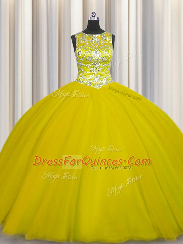 Scoop Floor Length Lace Up Sweet 16 Quinceanera Dress Gold for Military Ball and Sweet 16 and Quinceanera with Beading