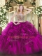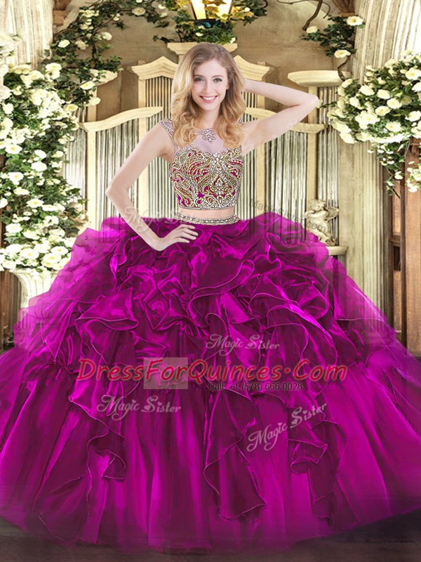Scoop Sleeveless Quinceanera Dresses Floor Length Beading and Ruffles Fuchsia Organza