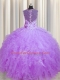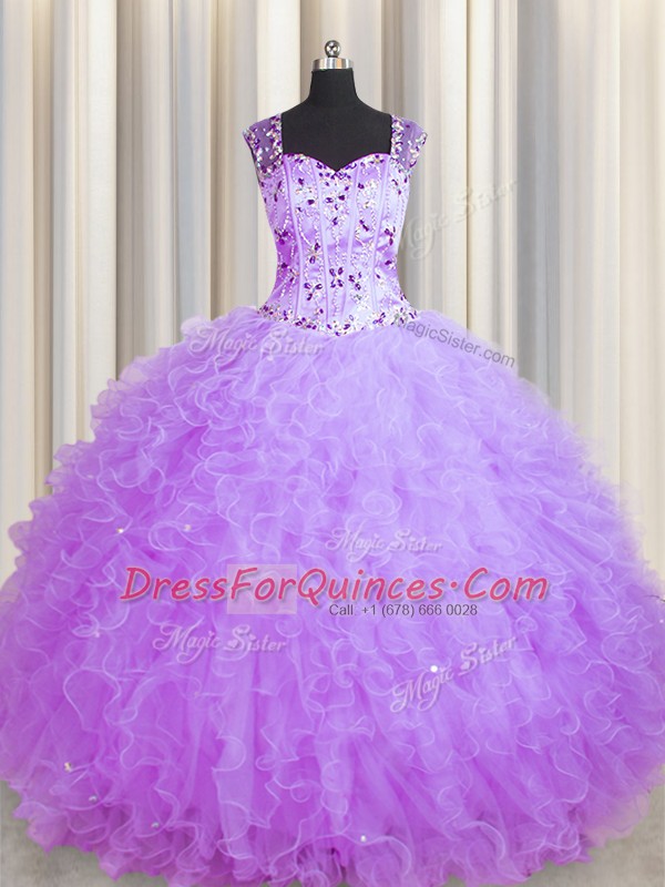 See Through Zipper Up Floor Length Zipper Quinceanera Dresses Purple for Military Ball and Sweet 16 and Quinceanera with Beading and Ruffles