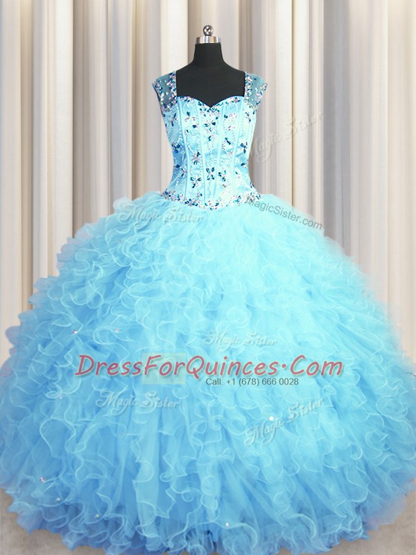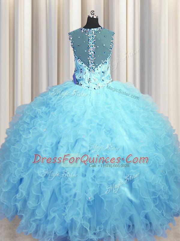 See Through Zipper Up Sleeveless Beading and Ruffles Zipper Ball Gown Prom Dress