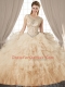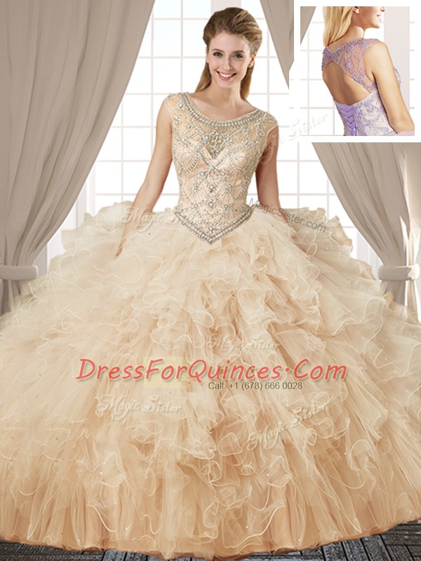 Sexy Scoop Champagne Ball Gowns Beading and Ruffles Vestidos de Quinceanera Lace Up Tulle Sleeveless Floor Length