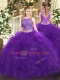 Simple Purple Two Pieces Scoop Sleeveless Tulle Floor Length Lace Up Beading and Ruffles Sweet 16 Dresses