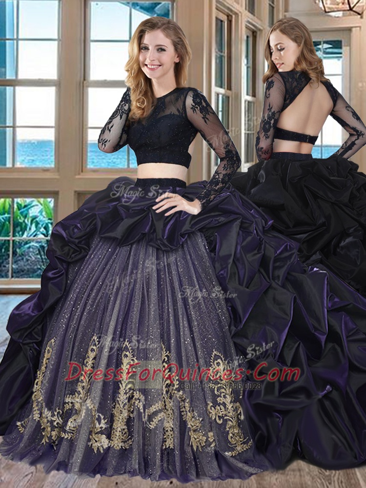 Stunning Scoop Long Sleeves With Train Embroidery and Pick Ups Backless 15th Birthday Dress with Purple Brush Train