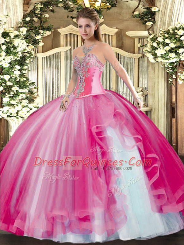 Super Hot Pink Ball Gowns Beading and Ruffles Sweet 16 Quinceanera Dress Lace Up Tulle Sleeveless Floor Length
