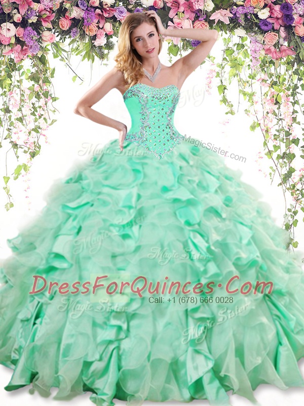 Sweetheart Sleeveless 15th Birthday Dress Floor Length Beading and Ruffles Apple Green Organza and Taffeta