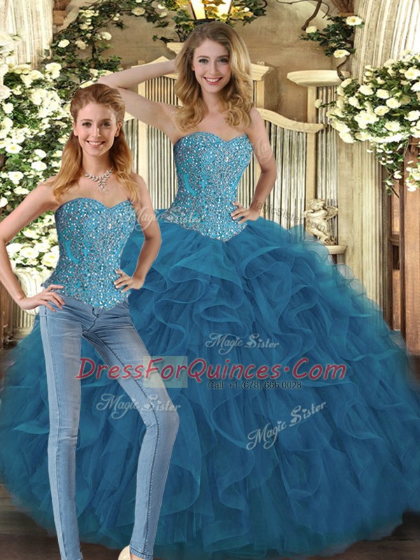 Sweetheart Sleeveless Quinceanera Gown Floor Length Beading and Ruffles Teal Tulle