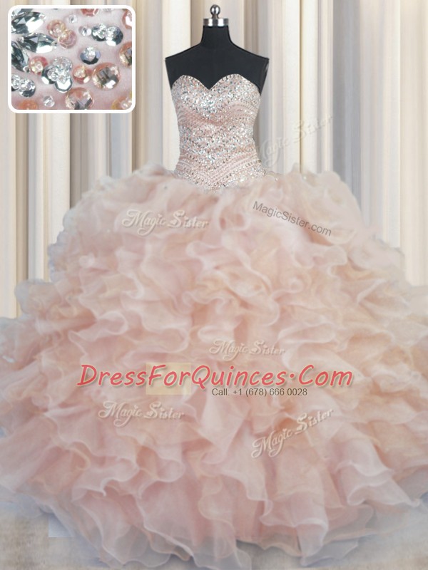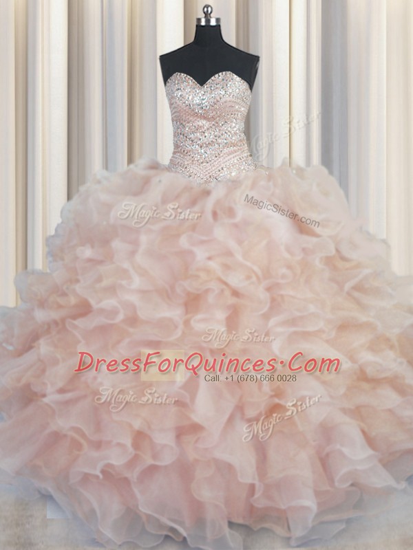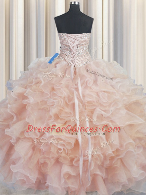 Top Selling Sleeveless Organza Floor Length Lace Up Quinceanera Gown in Champagne with Beading and Ruffles