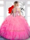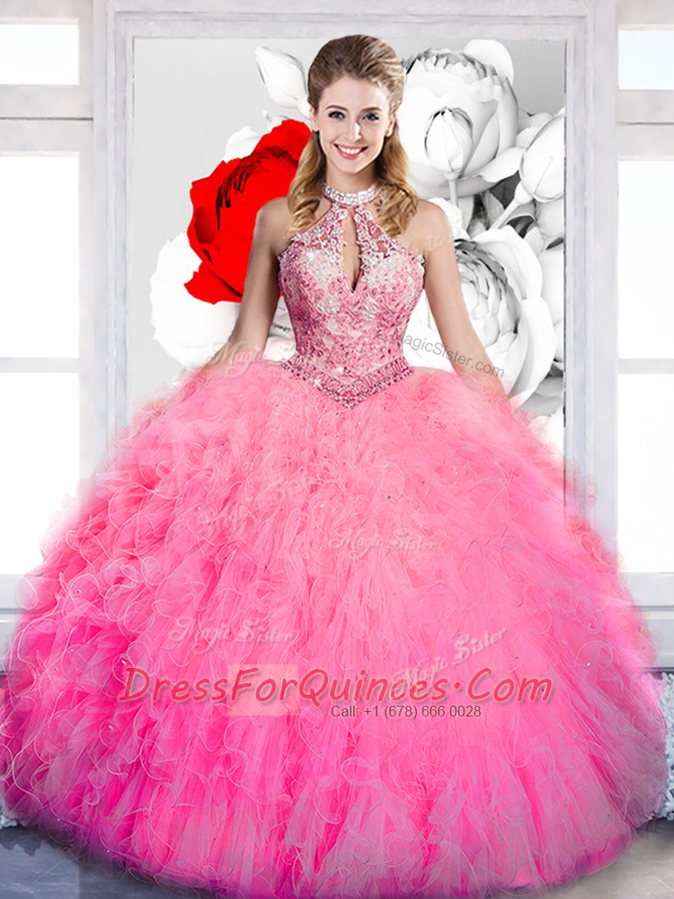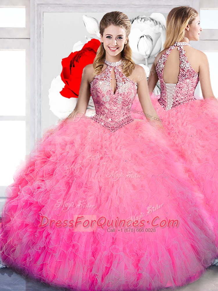 Unique Halter Top Sleeveless Floor Length Beading and Ruffles Lace Up Sweet 16 Dresses with Hot Pink