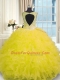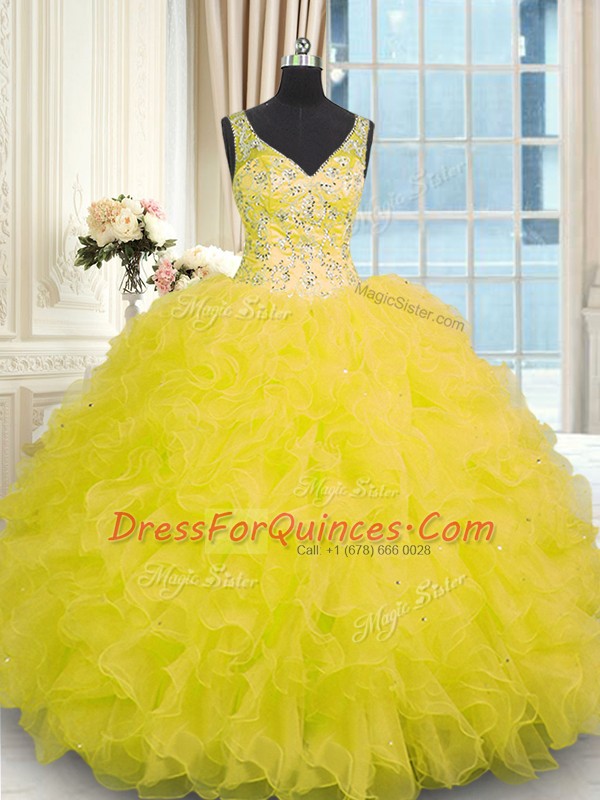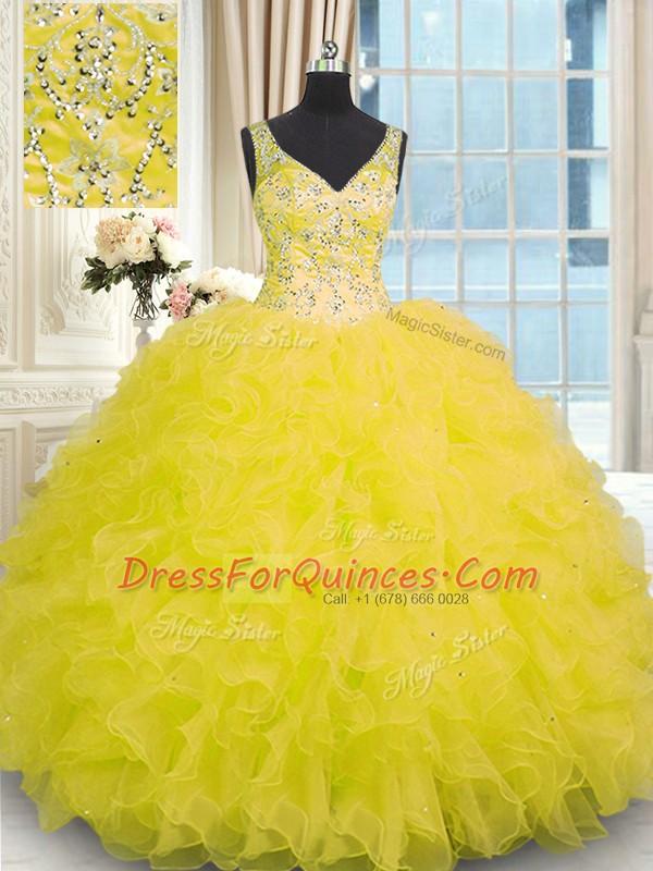 V-neck Sleeveless Zipper Sweet 16 Dresses Yellow Organza