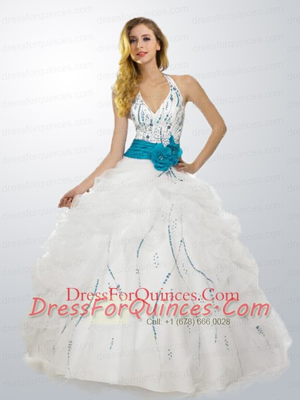White Halter Top Beaded Decorate 2015 Sweet 16 Dress with Sash
