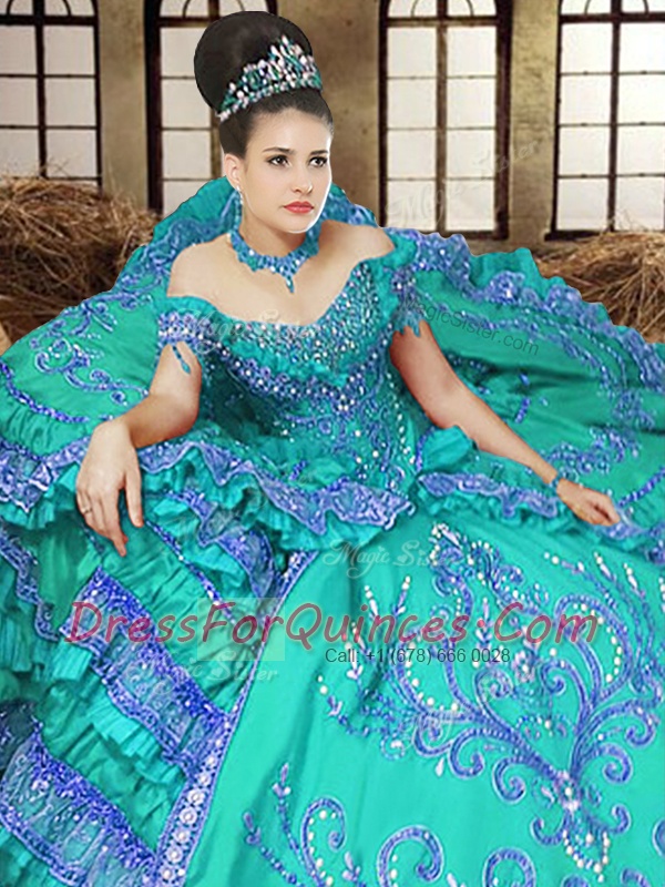 Admirable Ball Gowns 15 Quinceanera Dress Turquoise Off The Shoulder Satin Sleeveless Floor Length Lace Up