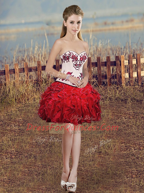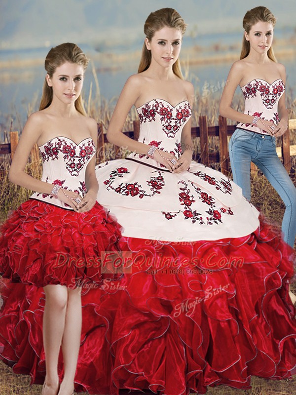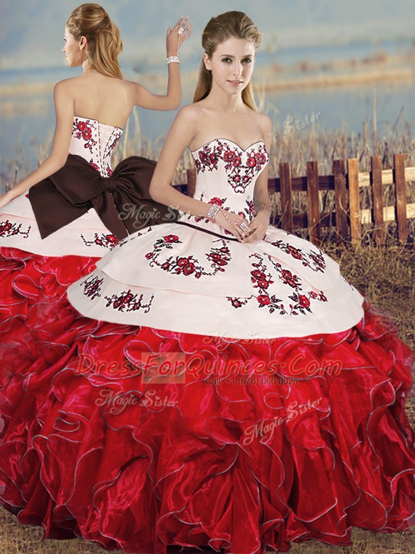 Admirable White And Red Sweetheart Neckline Embroidery and Ruffles and Bowknot Quince Ball Gowns Sleeveless Lace Up