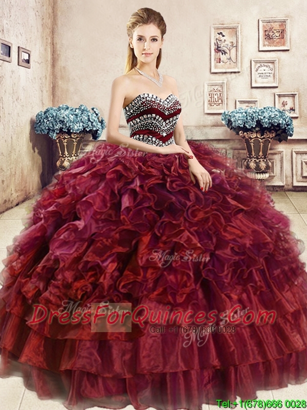 Affordable Beaded and Ruffled Wine Red Sweet 16 Dress in Organza